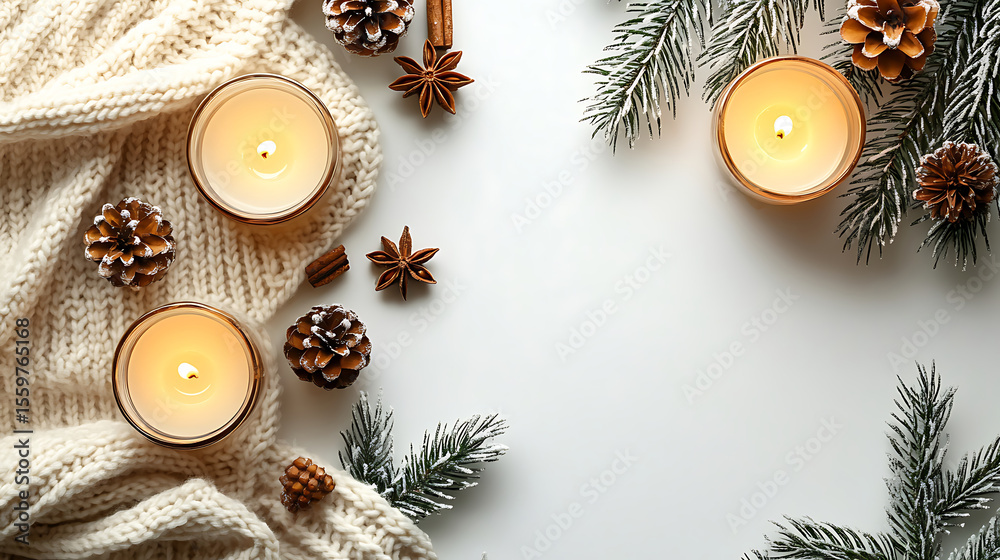 Cozy winter arrangement with candles pinecones anise and knitted blanket on a white background #1559765168