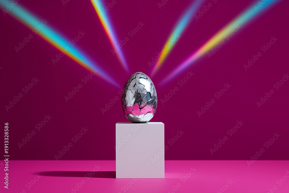 Cracked chrome easter egg on a white pedestal projecting rainbow glitter light beams in a surreal luxury product reveal concept against a solid deep magenta background. #1913328586