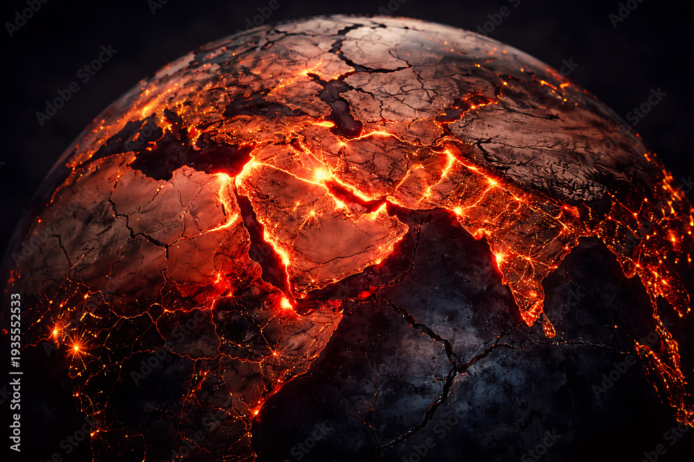 Cracked Earth globe glowing over Middle East region symbolizing geopolitical crisis and global instability #1935552533
