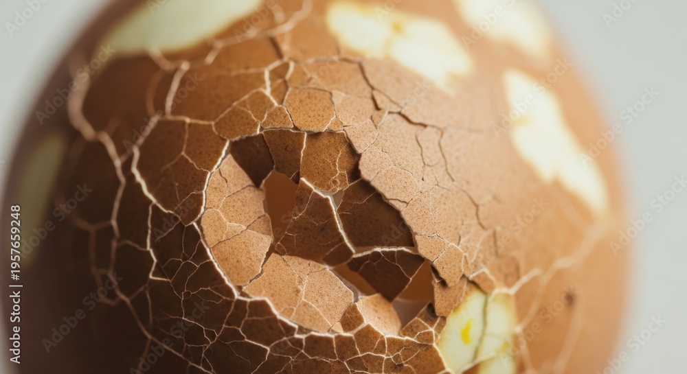 Cracked Eggshell Texture: Close-up detail of a cracked eggshell, revealing a complex network of fissures and textures, showcasing the intricate beauty of natural forms. #1957659248