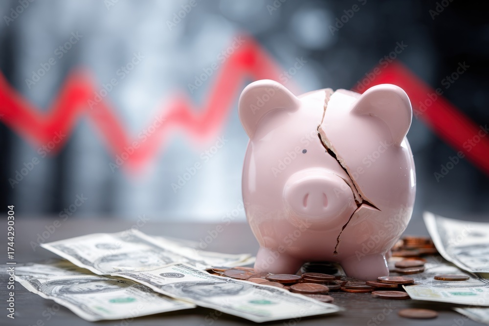 Cracked pink piggy bank surrounded by scattered dollar bills and coins, symbolizing financial struggles and economic downturn, with a downward trend graph in the background #1744290304