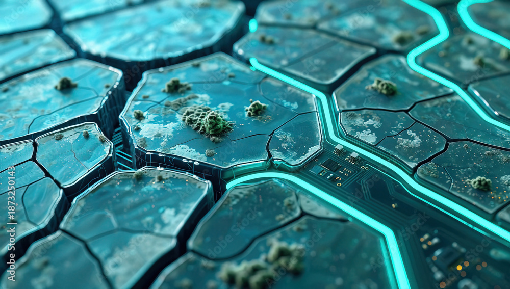 Cracked Teal Circuit Board with Glowing Lines and Green Growth #1873250143