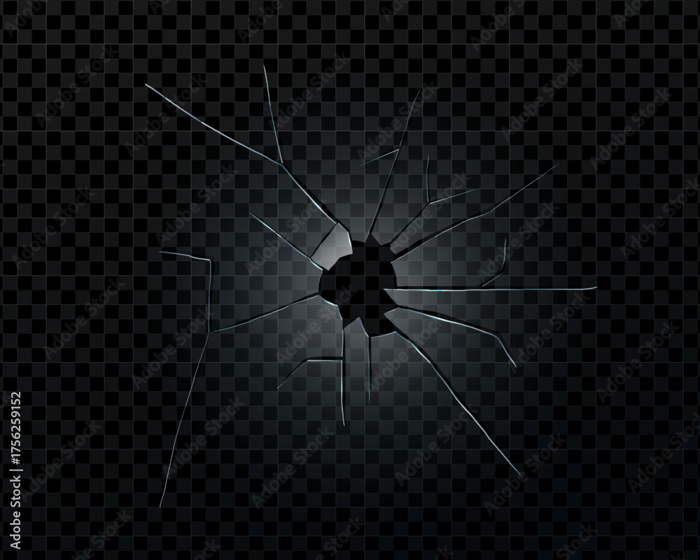 Cracked window glass with hole and bullet impact. Realistic broken mirror texture and transparent shatter pattern. Abstract isolated vector for accident, repair, or destruction themes. #1756259152