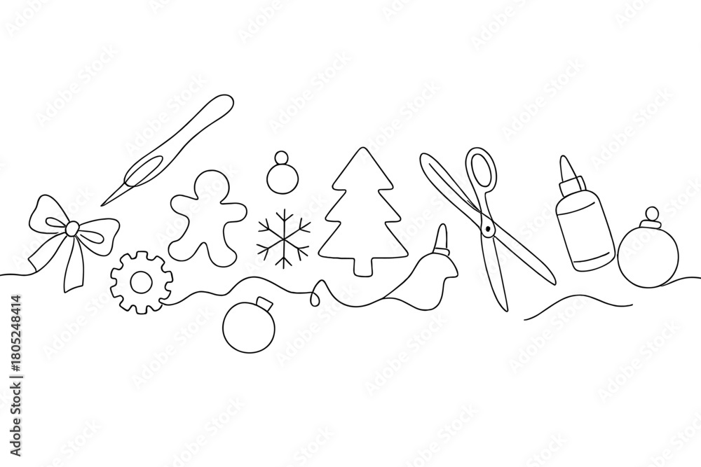 Crafting Tools Outline. Christmas craft table. Minimalistic one-line drawing scattered toy parts and crafting #1805248414