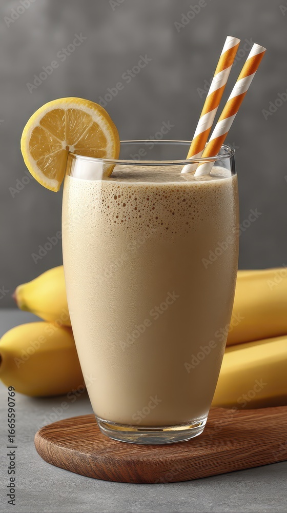 Creamy banana milkshake in glass, ripe bananas beside Perfect summer treat - summer delicious dessert countertop #1665590769