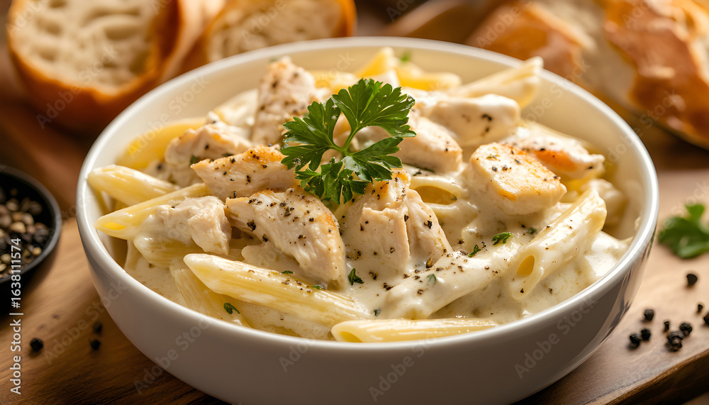 Creamy chicken alfredo pasta with garlic, parsley served in bowl with toasted bread slices. Penne noodles coated in rich, savory sauce #1638111574