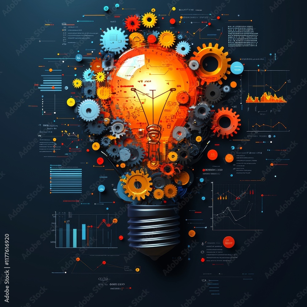 Creative Business Concept Branding Goals - A lightbulb with gears and charts, symbolizing innovative business ideas and brand strategy #1177616920