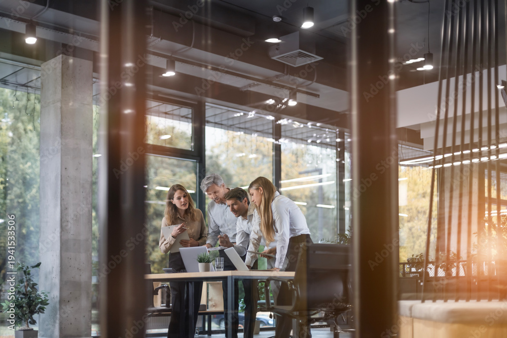 Creative business people, planning and meeting and brainstorming, ideas or strategy at office, view from glass wall #1941533506