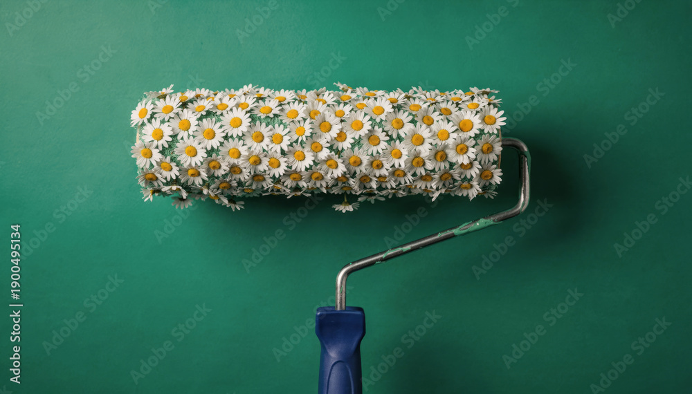 Creative concept of paint roller with fresh natural flower on green background. whimsical art idea for spring home improvement #1900495134