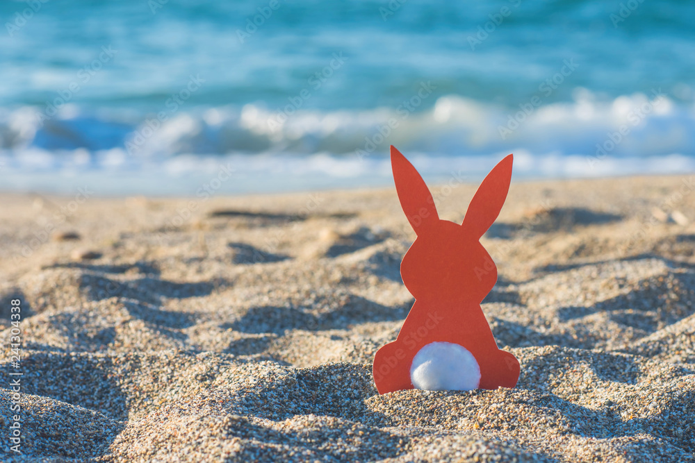 Creative easter concept photo of red paper bunny on the sand on the beach at sunset. Concept of Easter celebrations in tropical countries. #241304338