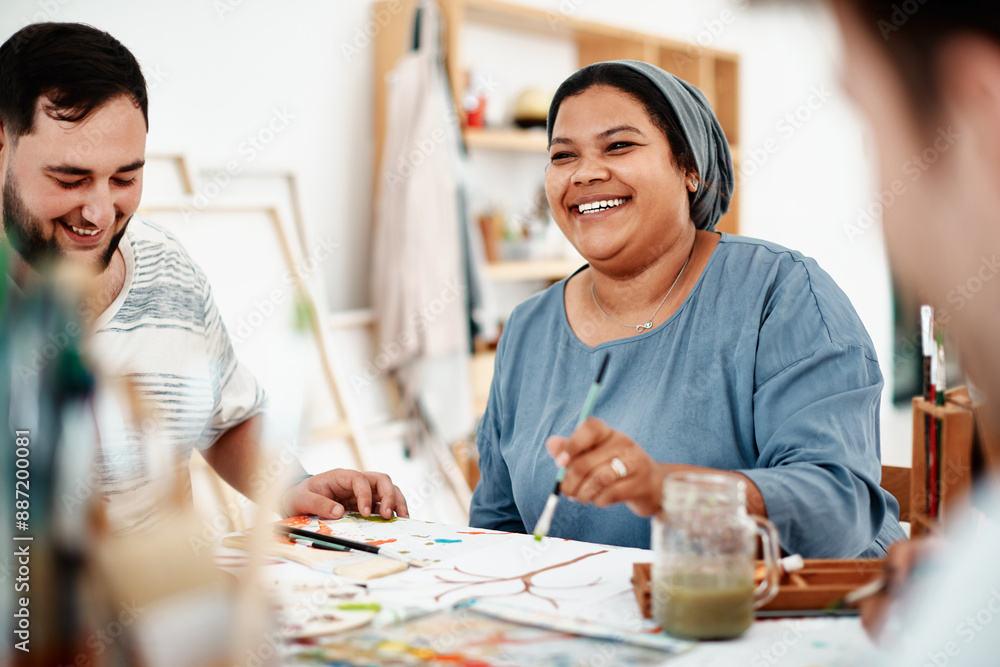 Creative friends, group and paint class for canvas, bonding and happy for art studio learning. Diverse people, smile and acrylic artwork for talent, artistic project and workshop for hobby or passion #887200081