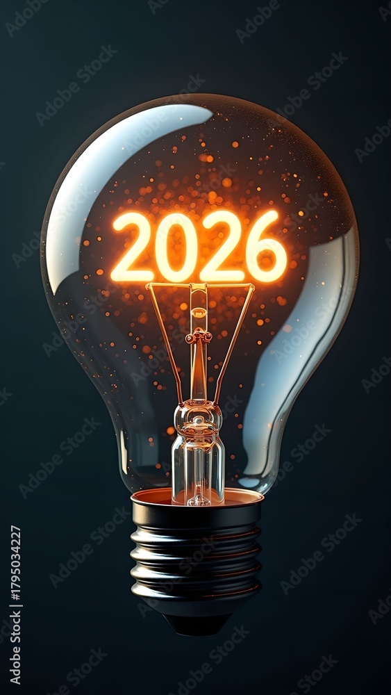 Creative light bulb design displaying the year 2026 in bright white numbers on a dark background. #1795034227