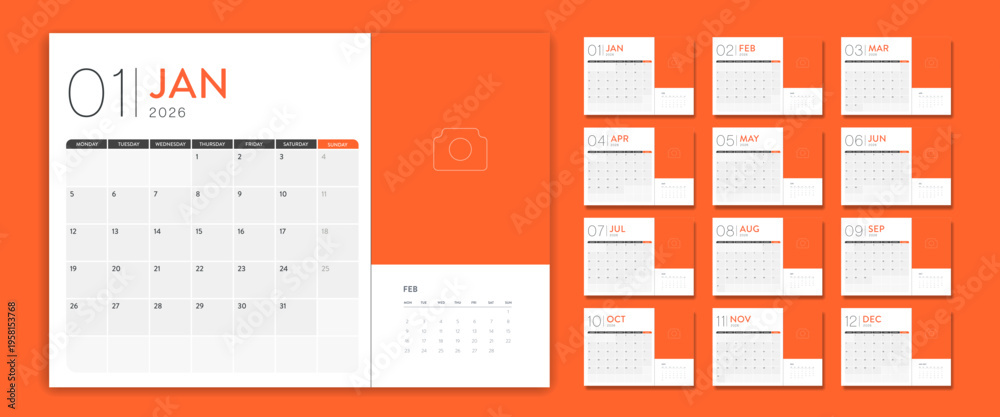 2026 Creative minimal business monthly Calendar template vector. Desk, wall calendar for print, digital calendar or planner. Week start on Monday. Simple modern annual calendar layout design elements. #1958153768
