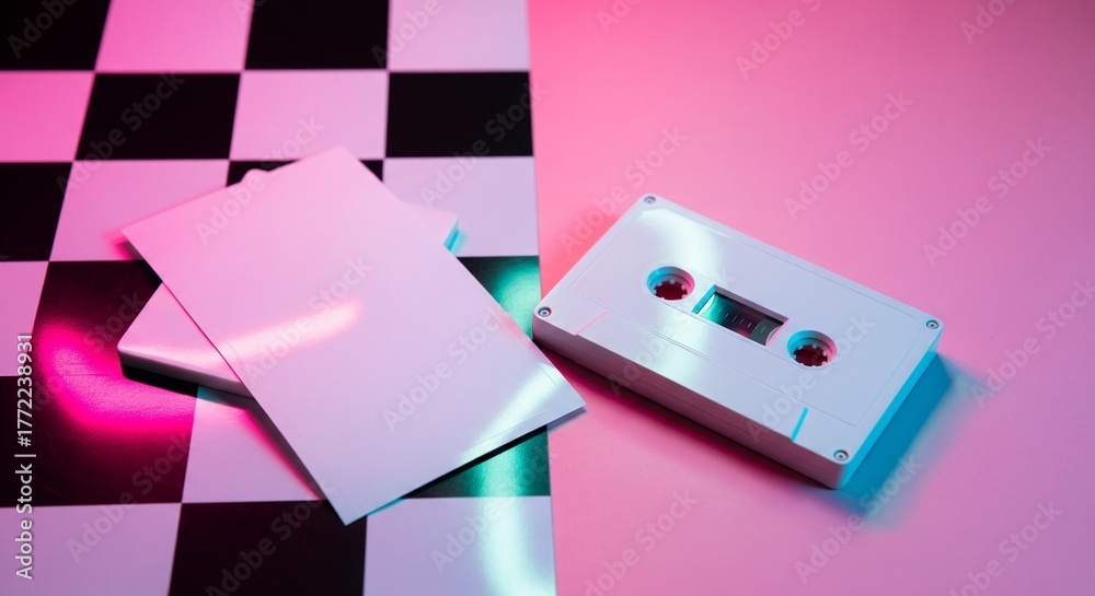 Creative still life of a classic audio tape and blank notes with neon glow #1772238931
