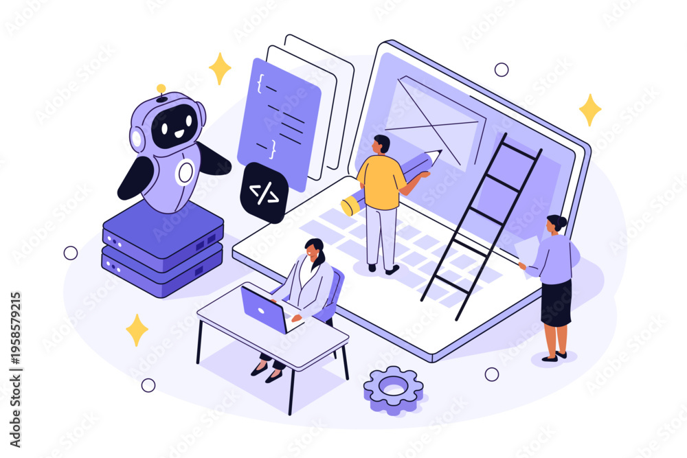 Creative team using ai agent for web design, prototyping, development. Artificial intelligence assisted business. Vector isometric illustration. #1958579215