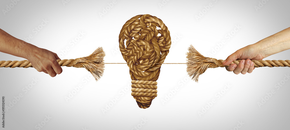 Creative Vision Battle as two opposing ideas in a tug of war pulling a rope on the verge of breaking with a lightbulb or light bulb symbol as a business metaphor for idea conflict. #1955124390