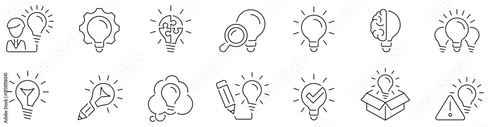 Creativity icons. Innovation icon set. Idea lightbulb. Brainstorming. Creativity lamp. Design thinking. Imagination. Process. Invention. Editable stroke. Vector illustration #1938116041