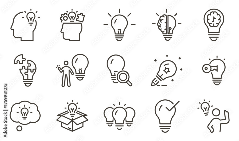 Creativity, innovation, lightbulbs and ideas icon set. Thin line editable stroke icons for brainstorming, imagination, design thinking, creative process, invention, inspiration, and problem solving. #1759981275