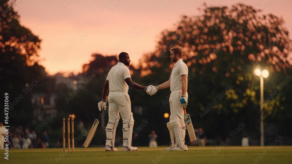 Cricketers exchange handshakes on the field as the sun sets, with stumps and trees evident in the background, representing the idea of sportsmanship and camaraderie. #1647331069