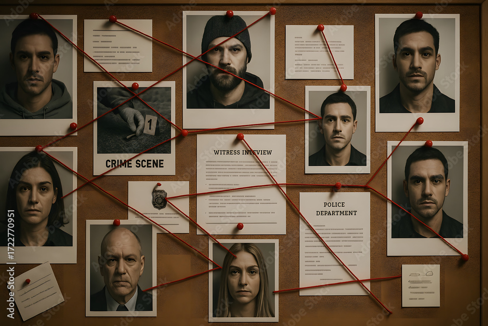 Crime investigation board with suspect photos and evidence connected by red string, detective case solving police investigation scene, mystery analysis conspiracy suspect identification law enforcemen #1722770951