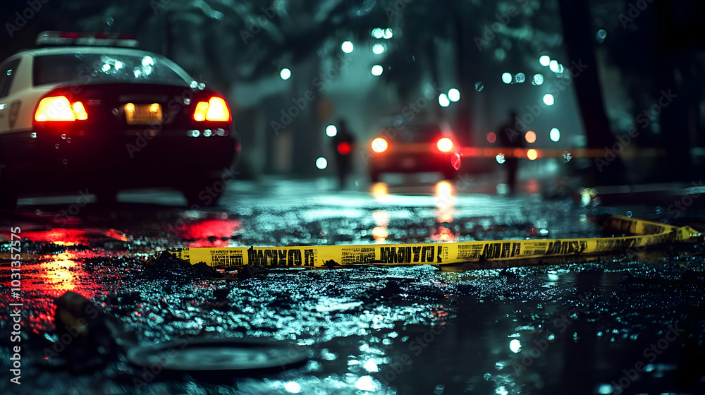 Crime scene with police cars and caution tape on a rainy night. #1031357575