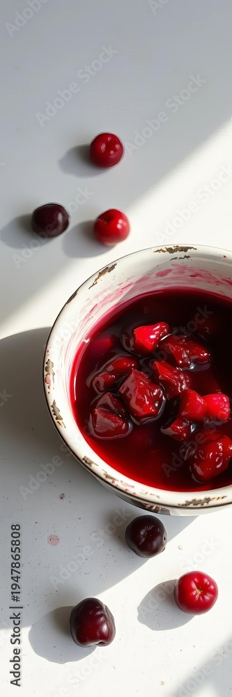 Crimson berry compote stains a chipped enamel bowl, a sweet, melancholic stain , crimson, vintage kitchenware #1947865808