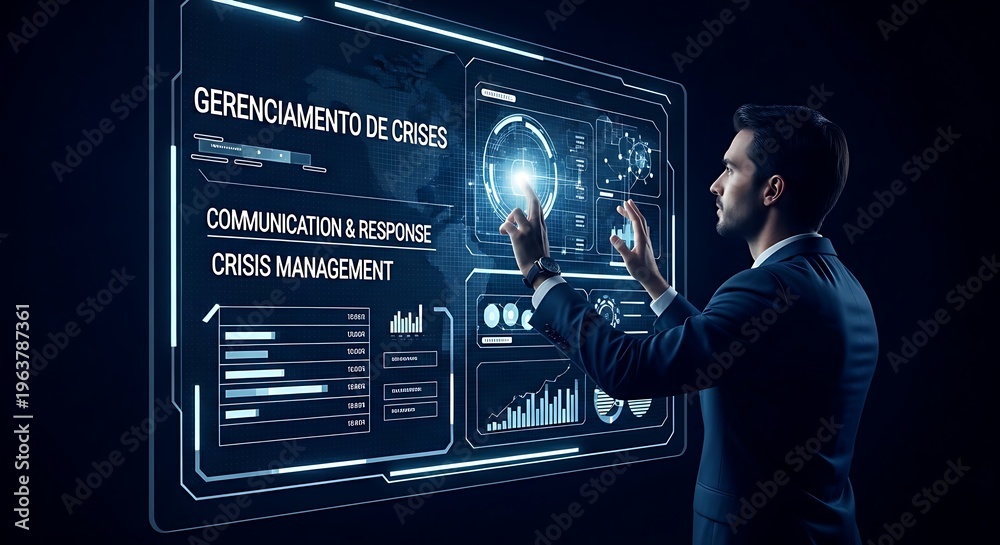 Crisis management concept. A specialist's hands simulate a crisis scenario on a holographic panel, activating a communication and response plan. #1963787361