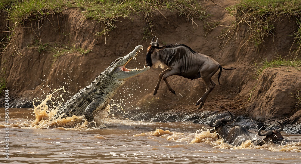 Crocodile Attacking Wildebeest in River #1367024004