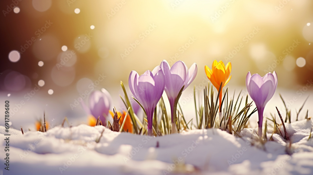 Crocus flowers emerge from the snow in early spring #691789680