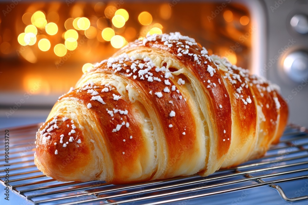Croissant recién horneado con azúcar glas sobre una rejilla frente a un horno encendido. #1908333720