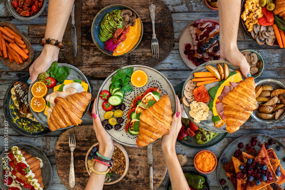 Croissant sandwich filled with ham, bacon, cheese and salad. croisandwich #1808512807