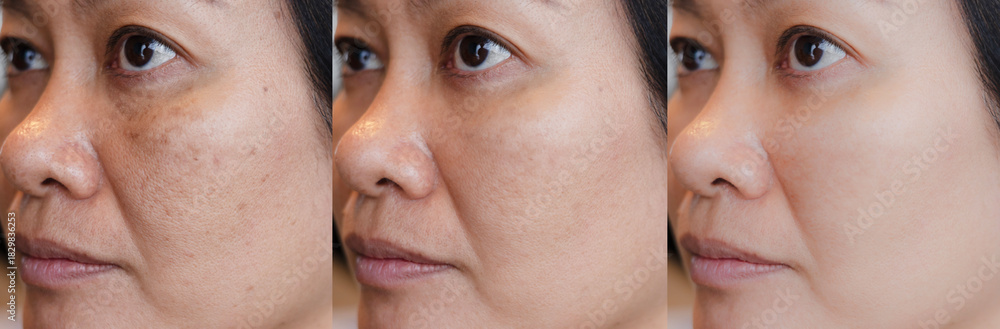 cropped Image before and after spot melasma pigmentation treatment on skin face asian woman compare in 3 development periods. Skincare and beauty concept #1829836253