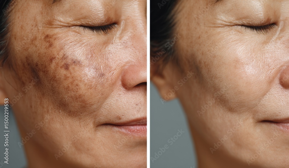 Cropped image showing before and after results of spot melasma pigmentation facial treatment on a middle-aged Asian woman's face, representing skincare and health issues #1500219553
