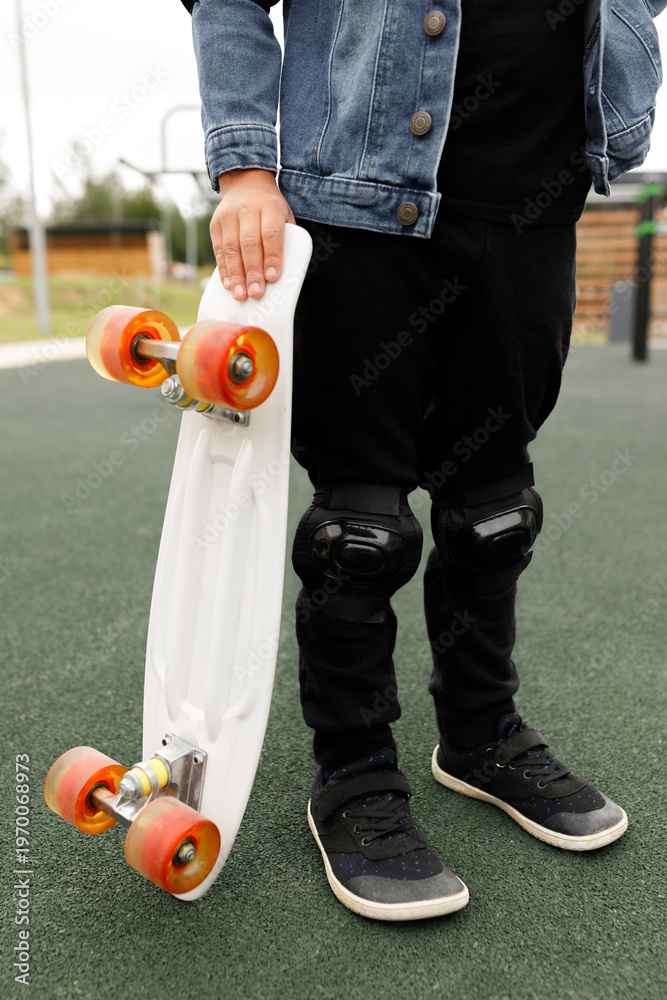 Cropped shot of a child holding a white penny board with orange wheels while standing on a dark grey rubberized playground surface, low angle view for extreme sports, childhood, and active lifestyle #1970068973