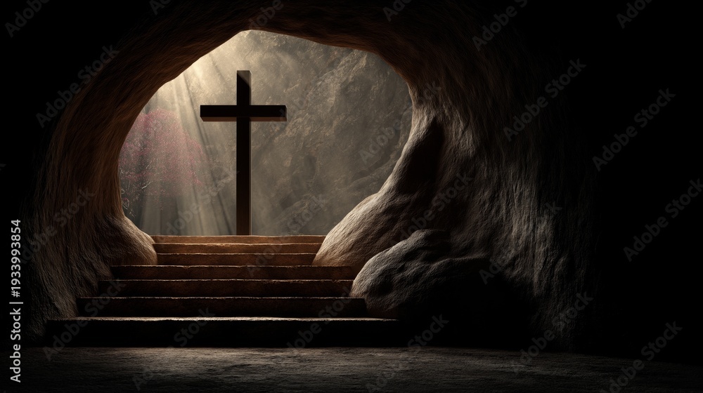 Cross on stairs leading from dark cave into light. Easter poster. Stone cross standing on steps inside a dark cave opening with bright light #1933993854