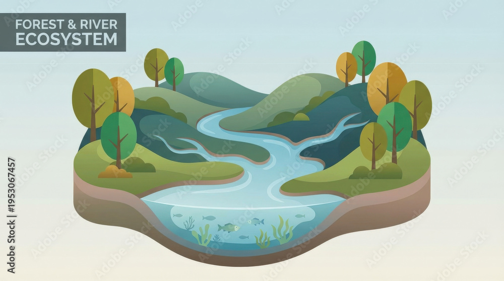 Cross-section of a vibrant forest and river ecosystem with diverse aquatic life and lush vegetation #1953067457