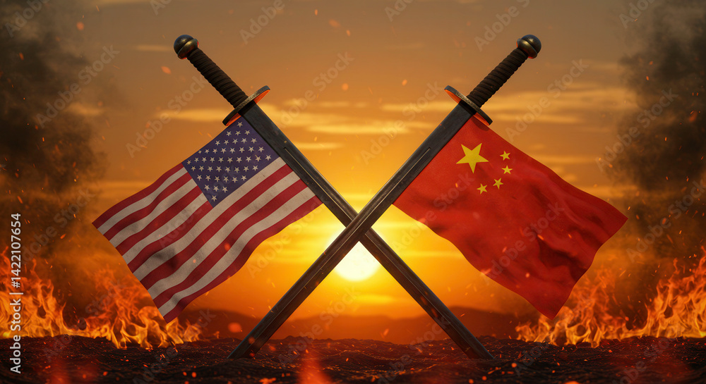 Crossed swords with the flags of the United States and China in a dramatic sunset setting, symbolizing conflict and rivalry between the two nations. #1422107654