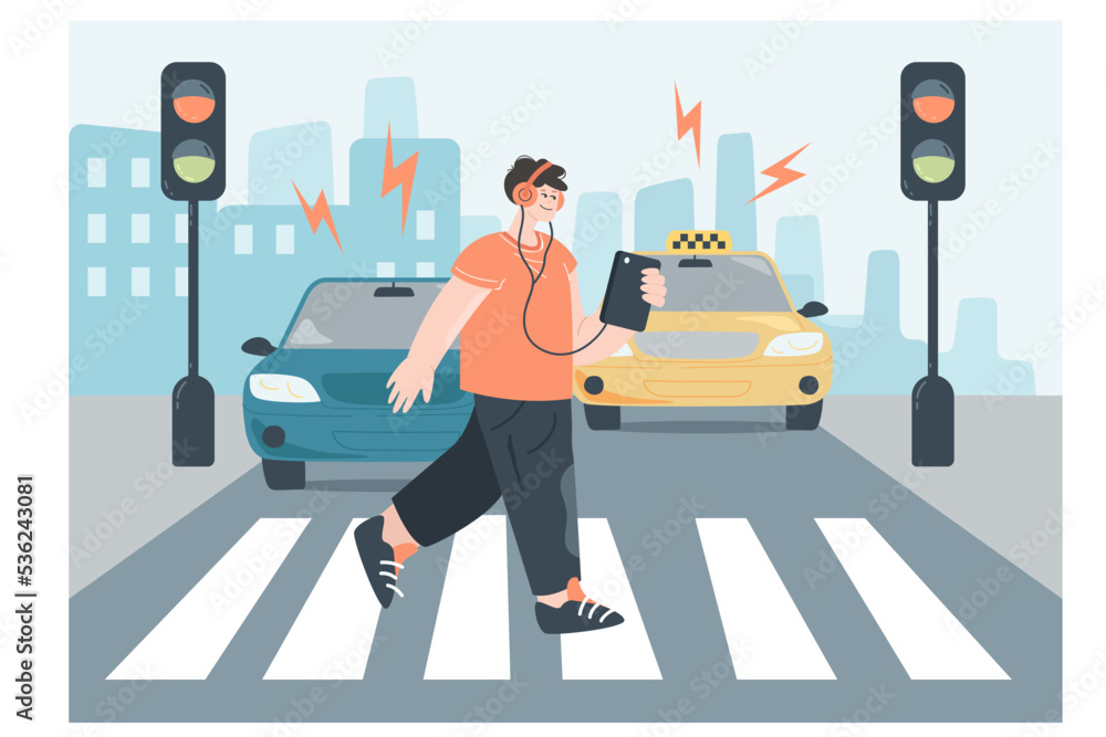Crosswalk accident flat vector illustration. Happy pedestrian with smartphone and headphones crossing road on red traffic lights. Safety, street traffic rules concept. #536243081