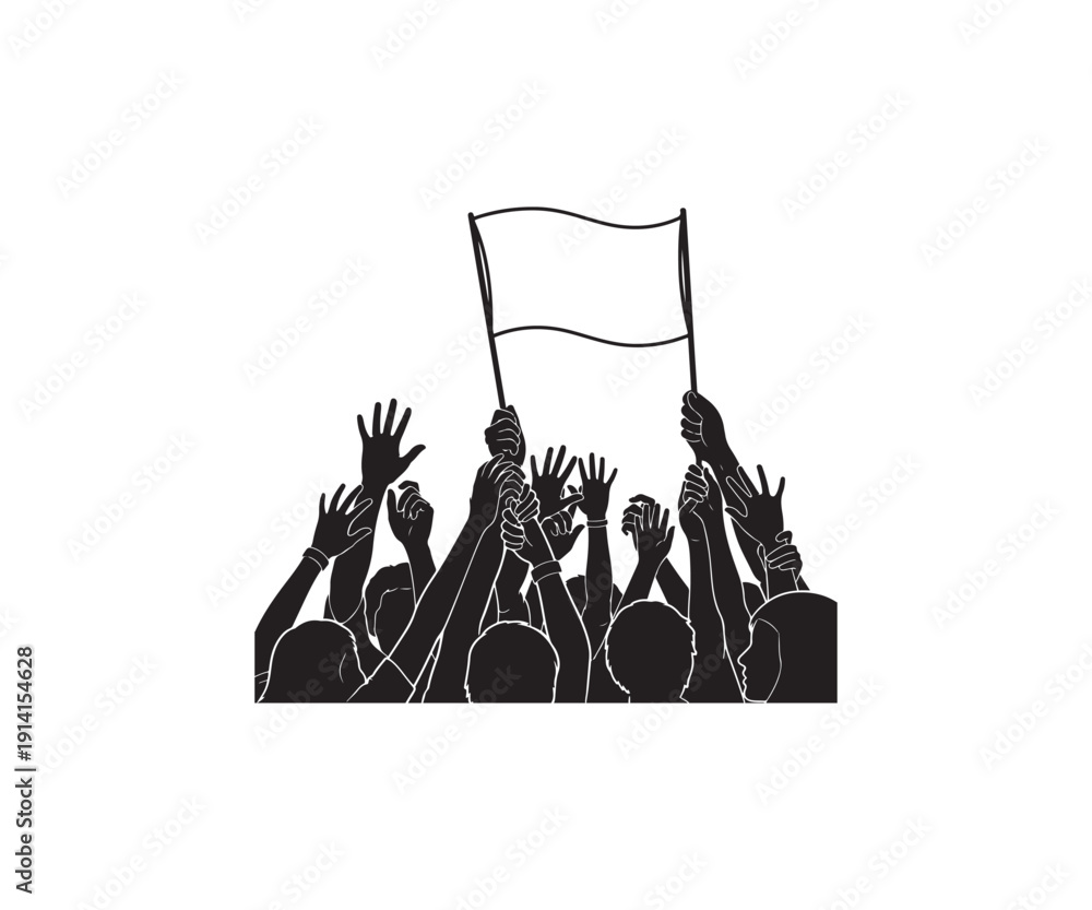 Crowd holding flag and raising hands in protest or celebration. #1914154628
