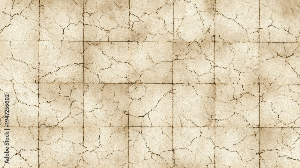 Crumbling grid texture of aged parchment like squares divided by dark crack lines, creating a seamless, distressed grunge wall surface with stained, weathered vintage appeal #1947255602