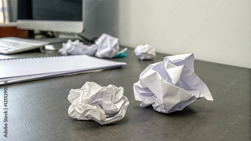 Crumpled white paper on a gray office desk, crumpled, document, sheets, wrinkled, messy #1215290216