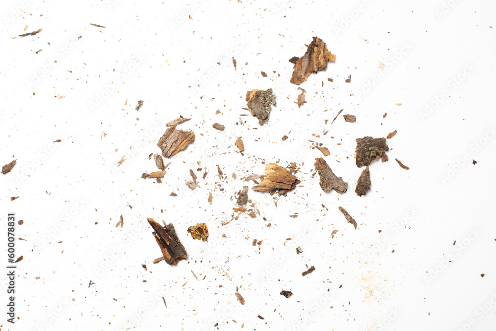 Crushed tree bark remains macro shot, small wood pieces splints isolated on white background #600078831