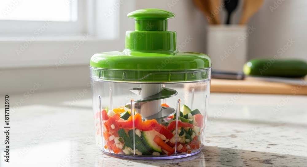 Culinary Symphony: A vivid depiction of a handheld food chopper with a variety of finely diced fresh vegetables inside. Ready for cooking. #1817112970