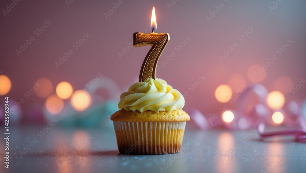 Cupcake featuring a number seven candle on a decorated table during a celebration #1425963944