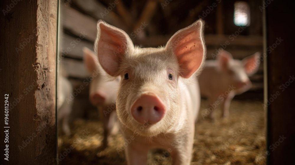 Curious pig looks at its own reflection in the mirror in a barn during natural light hours #1960112942