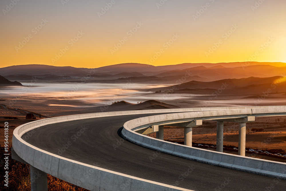 Curved concrete highway bridge overpass overlooking a misty valley landscape during a beautiful golden sunset in China. #1954611820