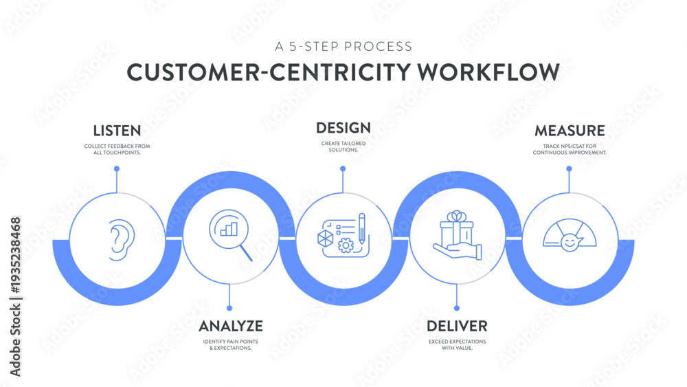 Customer Centric Workflow 5 steps Infographic Vector. 5 steps of Listen, Analyze, Design, Deliver, and Measure for continuous improvement. Strategic business strategy diagram and Presentation Slide UX #1935238468