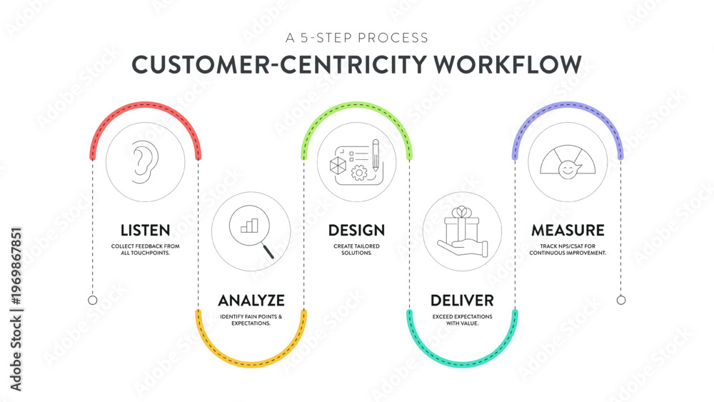 Customer-Centricity Workflow Infographic Vector Template. 5 Step Business Process Diagram. Listen, Analyze, Design, Deliver, Measure. CX Strategy for Feedback, NPS, CSAT Improvement Slide Presentation #1969867851