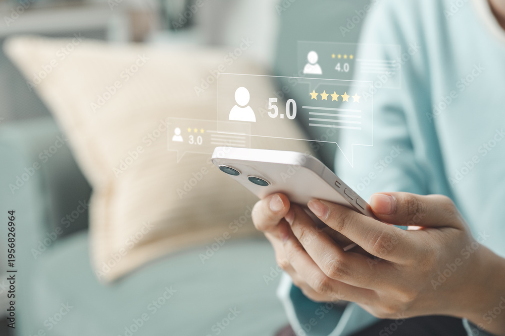 Customer reviewing service on smartphone with five star rating interface representing customer satisfaction, feedback system, online reviews and service evaluation. #1956826964