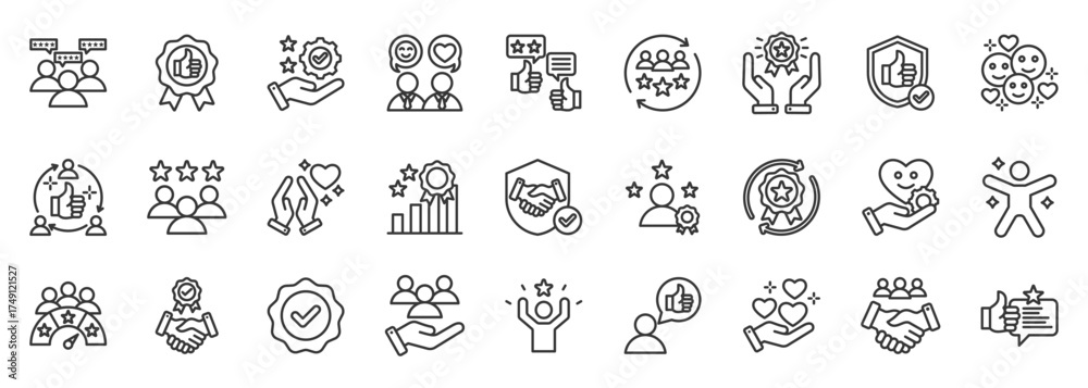 customer satisfaction icon set collection in outline style. icon pack contain loyalty, trust, happiness, feedback, review, service, smile, quality, experience, approval #1749121527